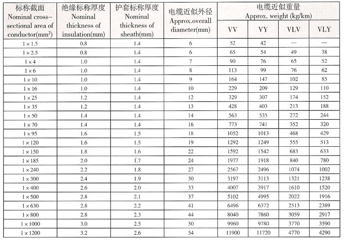 0.6/1kv聚氯乙烯絕緣電力電纜結構尺寸及允許連續載流量